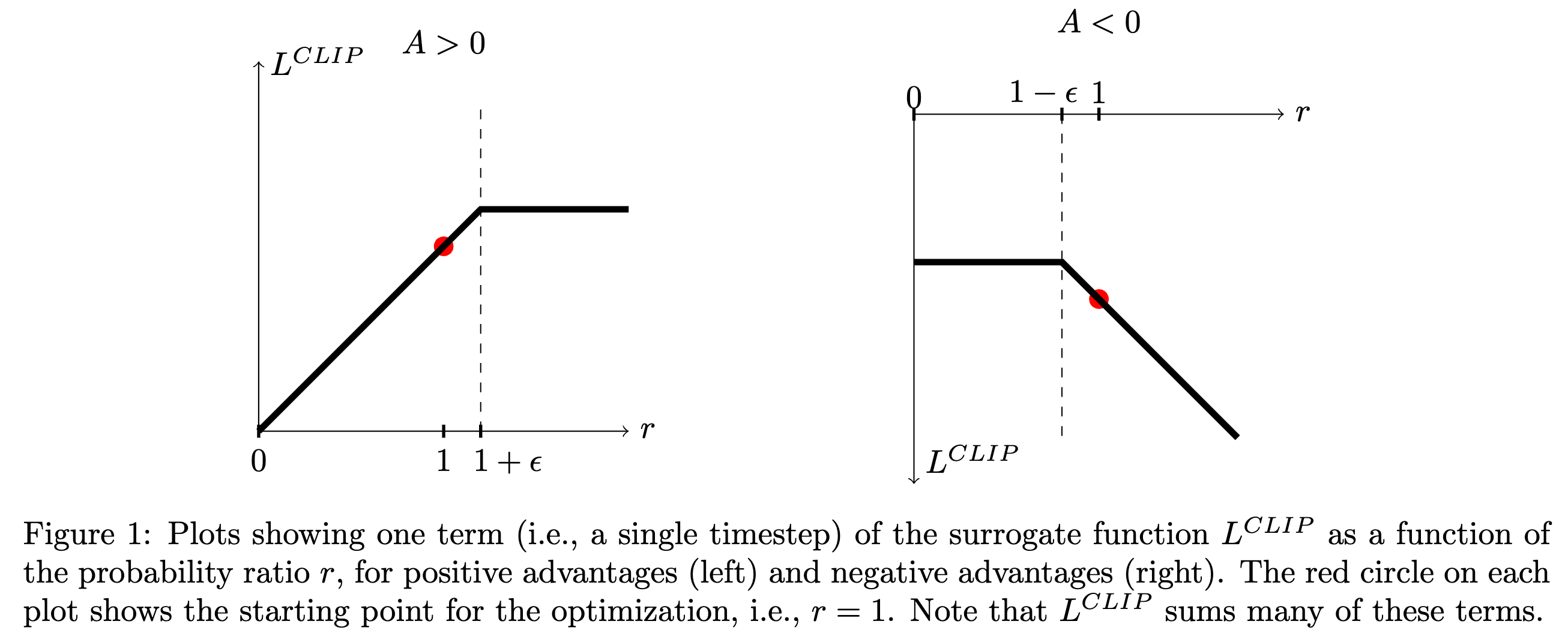 \[L^{C L I P}(\theta)=\hat{\mathbb{E}}[min(r_{t}(\theta) \hat{A}_{t}, clip(r_{t}(\theta), 1-\epsilon, 1+\epsilon) \hat{A}_{t})].\]第一项\(r_{t}(\theta) \hat{A}_{t}\) 就是 \(L^{CPI}\)。