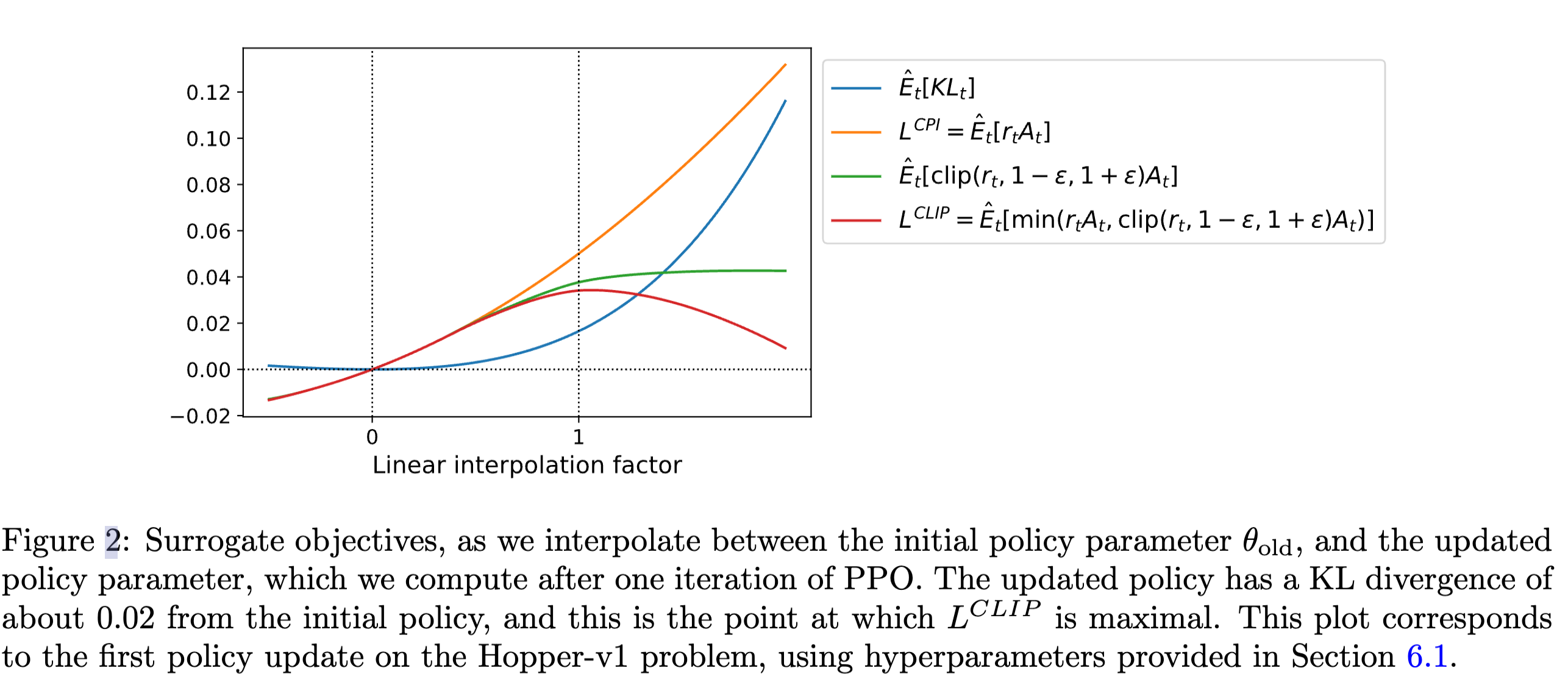 在 PPO 论文的 Figure2 中,线性插值因子是理解代理目标函数\(L^{CLIP}\)与原始目标\(L^{CPI}\)关系的关键。该实验基于连续控制问题,通过策略更新方向的线性插值(即从旧策略\(\theta_{old }\) 到新策略\(\theta_{new }\)的插值),展示了多个目标函数的变化趋势。