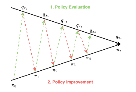 - Policy Evaluation: estimate q(s,a) witch sufficiently many episodes starting from (s, a)